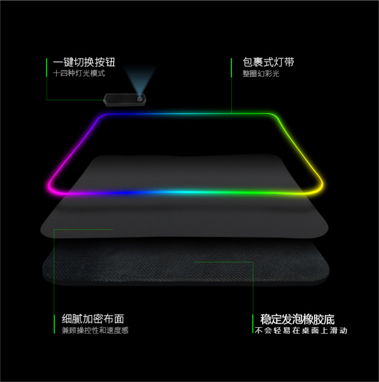 炫彩RGB游戲鼠標墊,織物面料編織,表面細膩、平整、操作穩定,帶燈光切換按鍵,輕輕一按,燈光可自由切換,加厚橡膠底部,穩固防滑